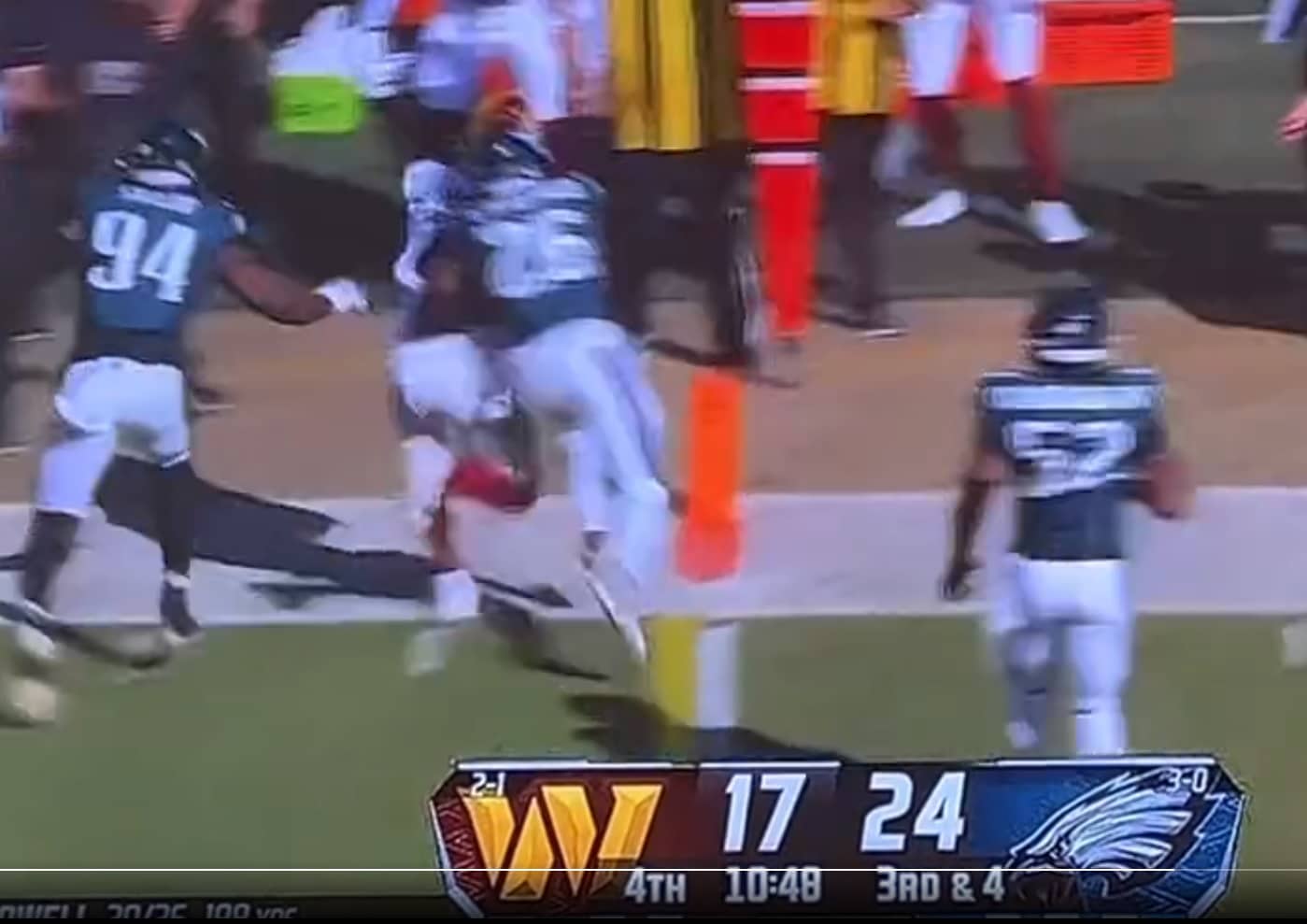 The sequence happened on Washington’s first 4th quarter drive, when they were down 24-17 and trying to rebound from the Eagles pitching a third quarter shutout. It was 3rd and 4 on this particular play, and if Edmunds was not flagged, the Commanders would have had the ball with 4th and 1 from their own 49 yard line, with a tough decision to make.