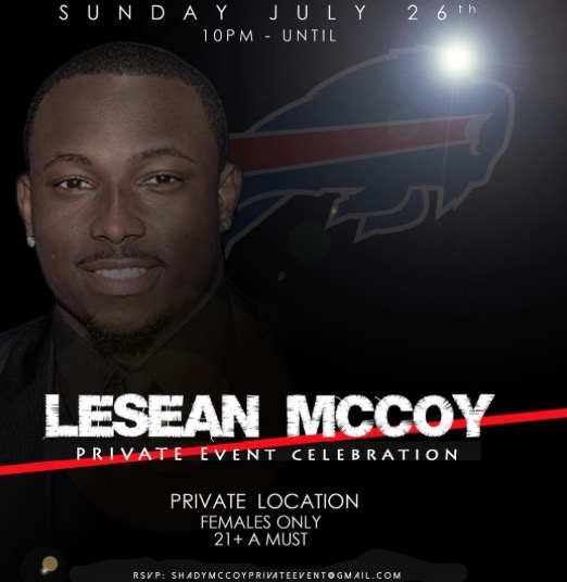 Bills running back LeSean McCoy posted this on his Instagram today. I’m sure the Bills are thrilled that he used their logo to promote his creepy, female adults only probably sex party with location TBA. I mean, what could go wrong at something like this? It’s not like you run the risk of getting kicked off the party bus en route to God knows where.