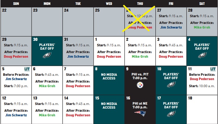 Day two of training camp kicked off three hours earlier than day one, and that’s gonna be the case for the rest of the weekend, with practice beginning at 9:15 followed by availability after the session. Jim Schwartz will speak today and Mike Groh will be at the podium tomorrow, followed by Doug again on Sunday.