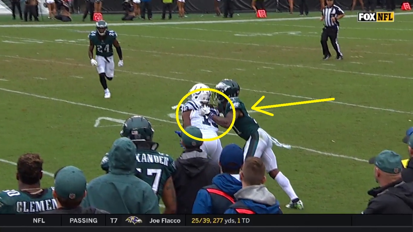 He just gets caught on the short throw and ends up running into the receiver, using his right hand to hook Hilton by the shoulder pad in clear view of the sideline official: