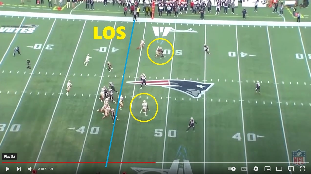 The reason this was brought up is because you can actually engage downfield on bubble screens, tunnel screens, and other slower-developing plays where the receiver is catching it deeper, behind the line of scrimmage. I pulled this Niners/Patriots still image to give you an example of that: