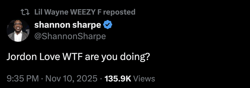 Damn. Coming after his neck. Wayne basically telling Love to go down to the Green Bay DMV and change your name because you don’t deserve to share it with the other great Jordans in sports. The Eagles won and this might be my favorite part of the entire game. One because the game was a snoozefest and two because I am the biggest Jordan Love hater there is. I don’t understand why the media, wait for it, loves him. I haven’t been impressed since he lost to the 49ers in the playoffs a couple seasons ago. Maybe that’s because he’s 0-3 against the Eagles lifetime. You never hear the Jordan Love criticism as loud as the Jalen Hurts criticism. I wasn’t even worried when Jalen Hurts fumbled late into that 15+ play drive because I knew Love was good for a baffling turnover himself and we got it a couple series later: