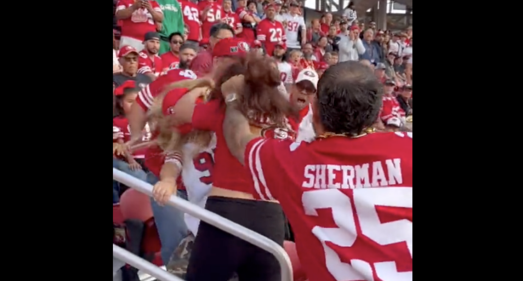 What a terrible fucking fanbase. Women snatching wigs, a dude pulling a woman’s hair, and another putting his hands on one. Lock everyone involved up. This is disgusting behavior. I’ve never seen a fanbase fight each other more than the 49ers fans do. It’s a bunch of savages out there. We just had a fan die in a fight at the Patriots game four days ago. You’d think they’d take a week off out of respect. Just lower life scumbag shit.