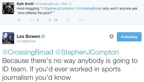 I know it seems like I pick on Les around here, and maybe I do, but sometimes he just makes it so easy. A few weeks ago, when Chip Kelly quelled the fears of beat writers everywhere during an ostensibly impromptu press conference at the NovaCare Complex, I jumped on Les for being more concerned with why Howie Roseman’s desk was moved than following up when Chip admitted that he was offered a first round pick for Sam Bradford. Who was it?, I wanted to know. Les retorted: