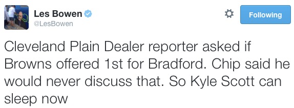 Meanwhile, Eagles coach Chip Kelly wouldn’t say if the Browns were the team that offered him a first-rounder for Bradford the morning after he acquired him.