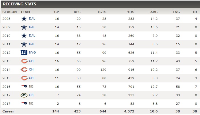 Bennett really fell off this year after a productive 2016. He signed a 3 year, $21 million deal with Green Bay but was placed on waivers with the Packers claiming that he had failed to disclose a medical condition.