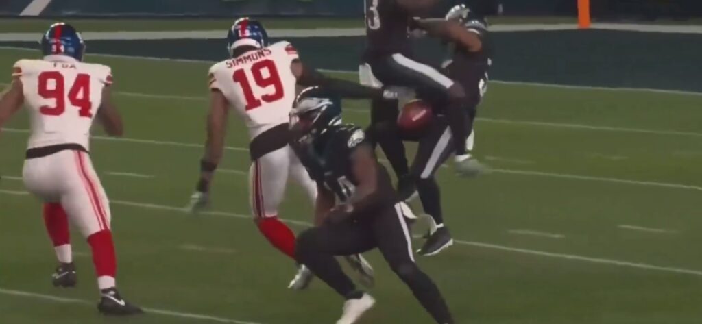 This was the 3rd quarter kickoff from Monday night. The Birds were up 20-3 and coughed it up inside their own 15, resulting in New York punching it in with Saquon Barkley three plays later to cut the lead to 20-10.