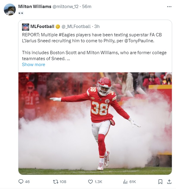 Let’s get it back to the Eagles, with Milton Williams eyeballing a report that he’s one of the Eagles texting L’Jarius Sneed in an attempt to recruit him to Philadelphia: