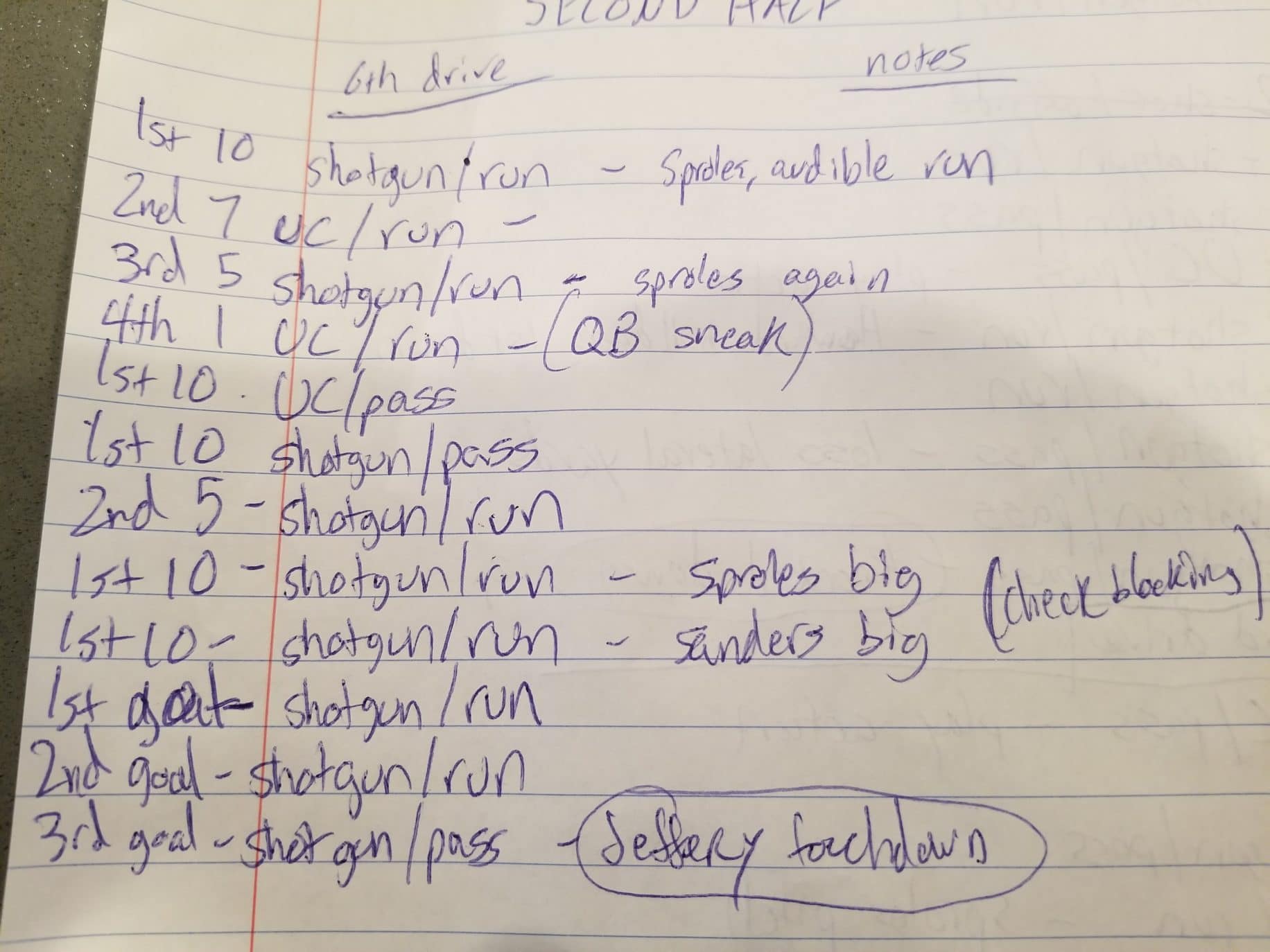 It’s worth pointing out that the Eagles’ best stretch in the running game came on the first drive of the second half, when Doug put the ball on the ground five times in a row. As you can see here on my shitty handwritten notes, the Birds ran it nine times on the 12-play drive that went 75 yards and took 7:10 off the clock:
