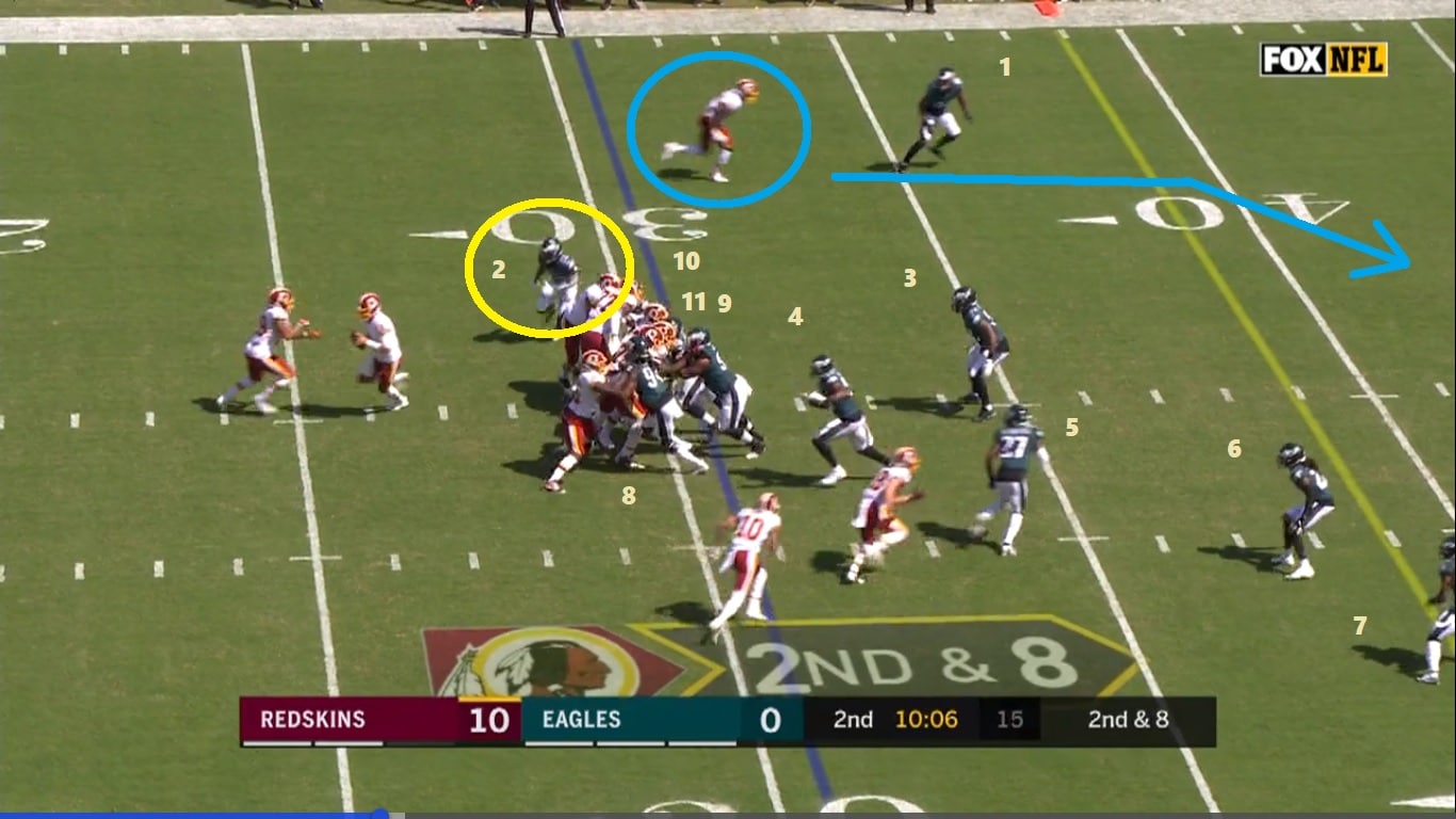 Safety blitz, looks like Rodney McLeod free off the corner and a really nice pickup from Derrius Guice. All 11 Eagles are up near the line so there’s no help over the top, which results in Douglas getting diced 1v1. He’s not the fastest guy in space, so he’s a sitting duck in that situation without a high safety out there to cover for him.