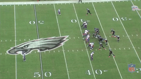 Just as the ball is snapped, the Vikings roll back their left cornerback, putting two high safeties over the top, and then have Smith drop out to cover Dorial Green-Beckham. Meanwhile, both linebackers hesitate, then roll over the top and blitz Wentz’s left side. The play actually results in an interception, primarily because Green-Beckham completely stops his route in the middle of the field.