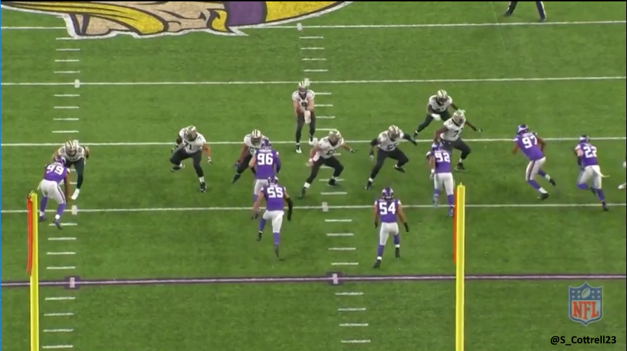 In the clip below, watch how disciplined each man plays along the line. The defensive line takes away the front side gaps, forcing Alvin Kamara to cut back inside to a waiting Eric Kendricks, who displayed great patience letting the play come to him: