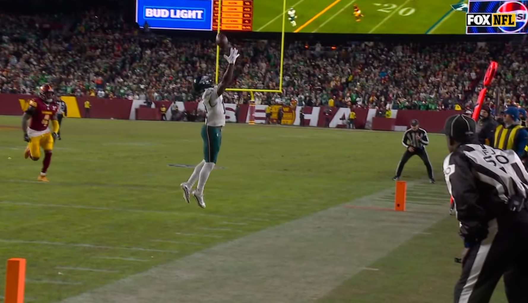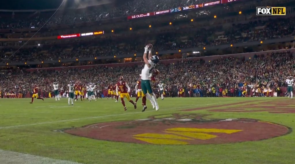 17) What a shitshow at the end of the third. First, Washington is called for interference on a play that wasn’t interference, then a there’s a borderline false start on a tush push. Fred Johnson then gets whistled for an obvious hold and the Eagles score anyway on 3rd and 15. This ball came out wobbly, but what a throw on the run. Jalen really put it in a great spot for Goedert to go up and snag: