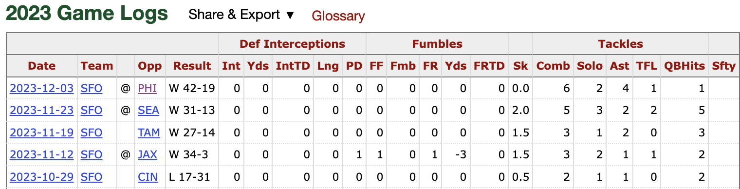Coming into the game Sunday with 5.5 sacks and 12 QB hits over his last four games makes his stat line on Sunday look mighty pedestrian: