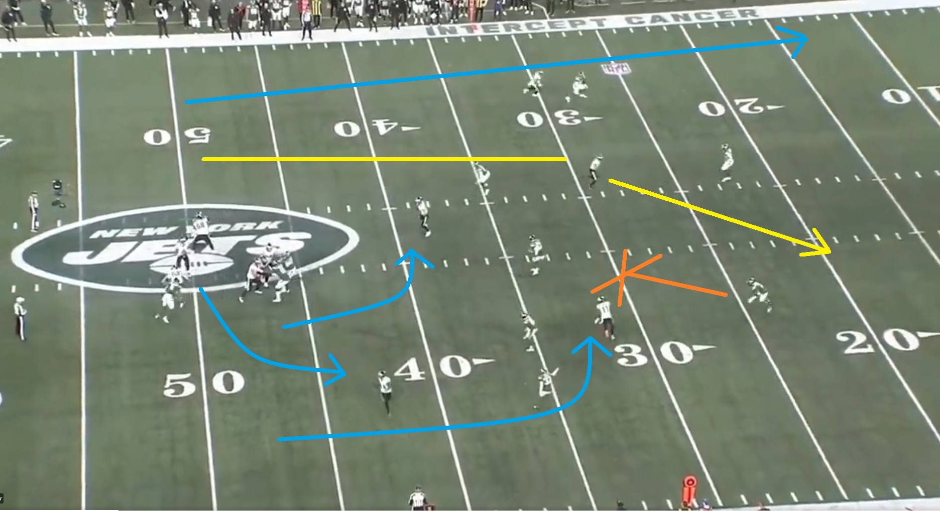 I see a couple of things here. It’s 11 personnel, their typical setup, with one running back, one tight end, and three receivers on the field. Kenneth Gainwell runs a little flat pattern, so there’s no chip to help Driscoll, who is 1v1 with Jermaine Johnson. Dallas Goedert runs a little five yard joint, A.J. Brown is pulling the second safety down, and they’re trying to get DeVonta Smith on a deep post coming out of the slot: