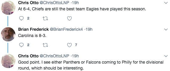 Also a bad take: The Eagles are the Alabama of the NFL, having played no one at this point.— Chris Otto (@ChrisOttoLNP) November 26, 2017
