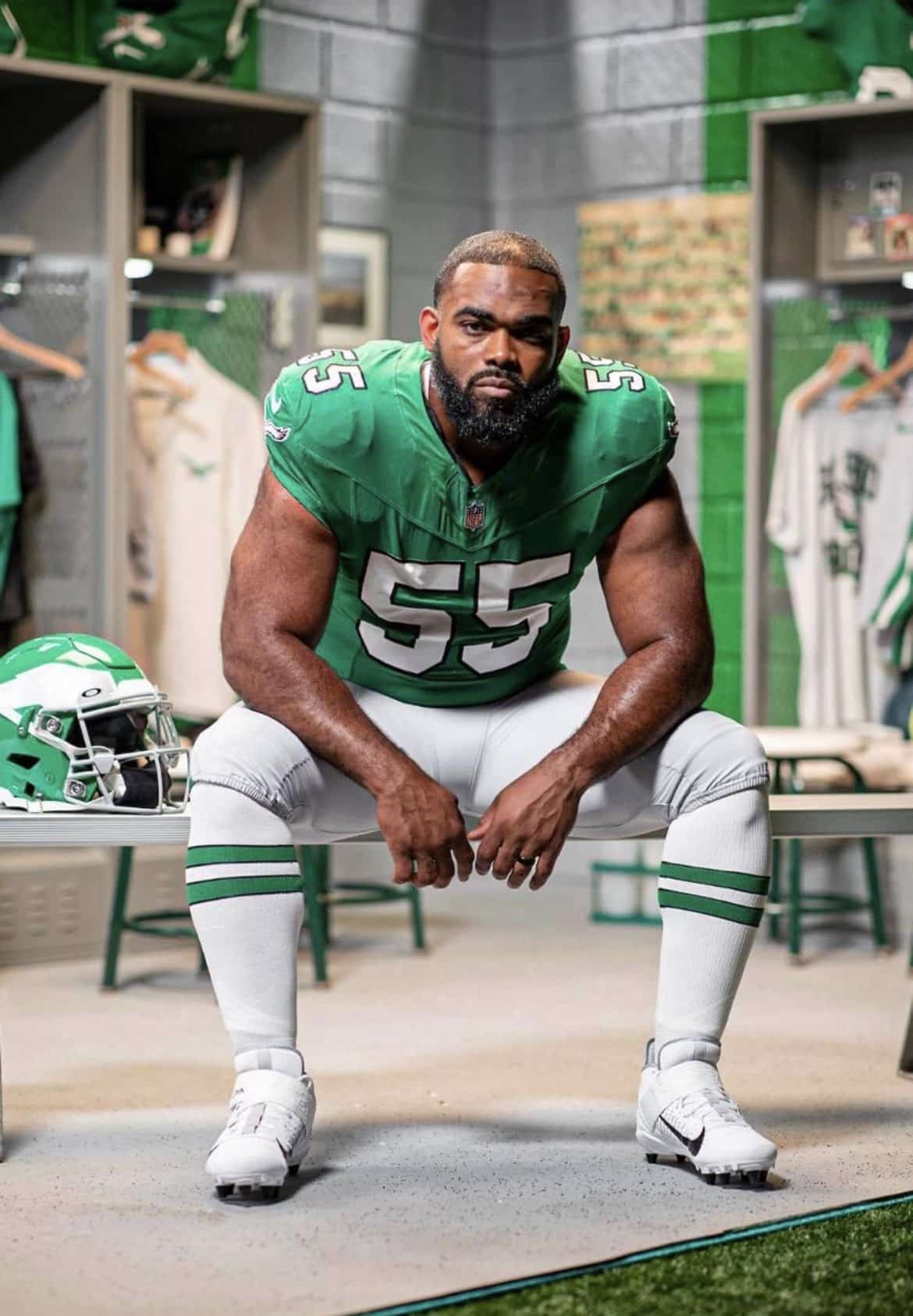 It’s true that a lot of shitty football was played in Kelly Green, but there was also a lot of great football played in those colors. The Eagles won championships in the 1940s and 1960s wearing Kelly Green. Harold Carmichael went to four Pro Bowls and won the conference in Kelly Green. Reggie and Chuck Bednarik were six-time All Pros wearing the color. So if you expand your view of the motif beyond that feckless late 80s/early 90s stretch, there are plenty of worthy moments to focus on. Plus, it’s not a loser color if winners are wearing it, exemplified perhaps by this banger of a Brandon Graham photo that leaked over the weekend: