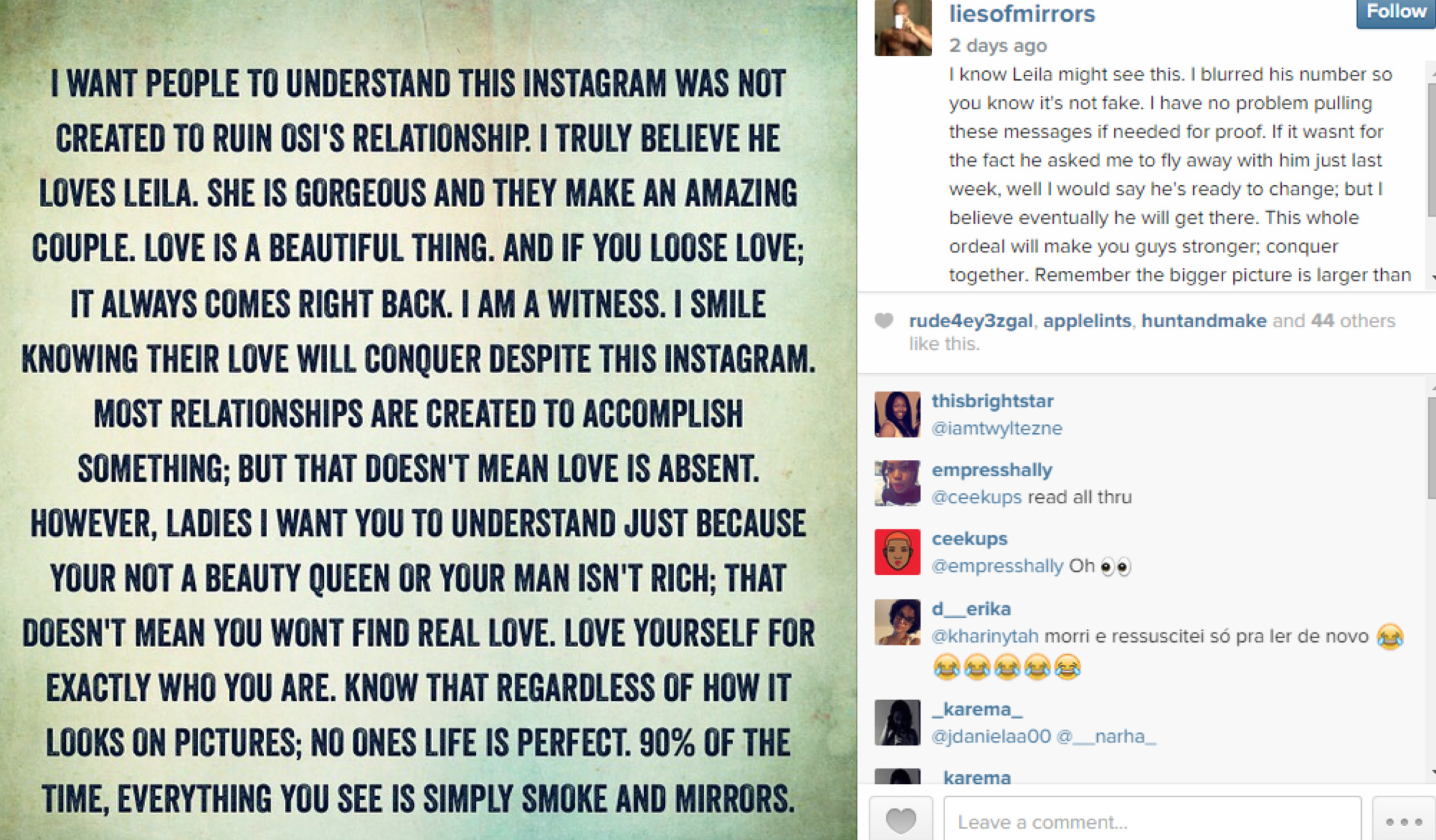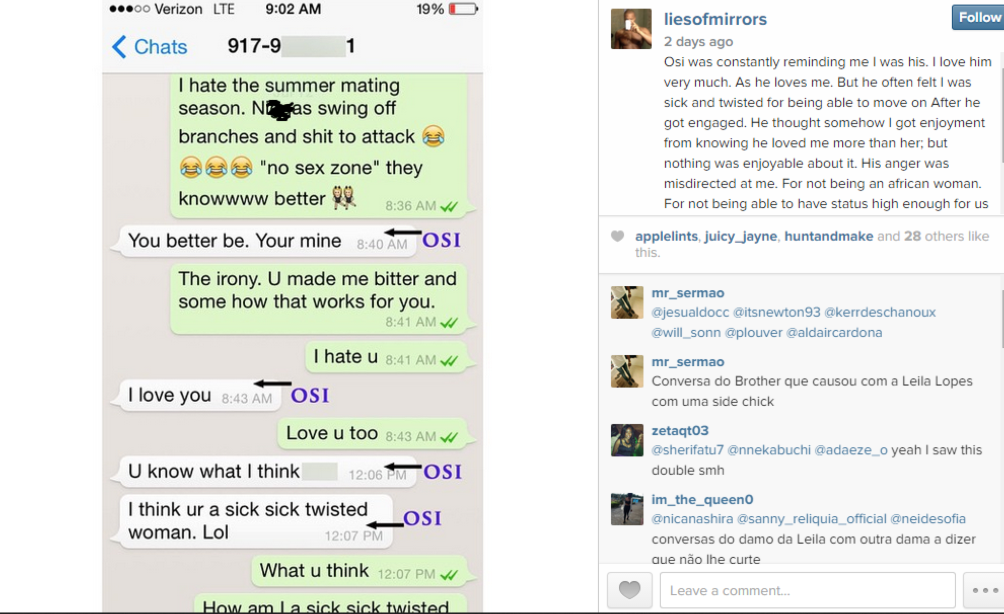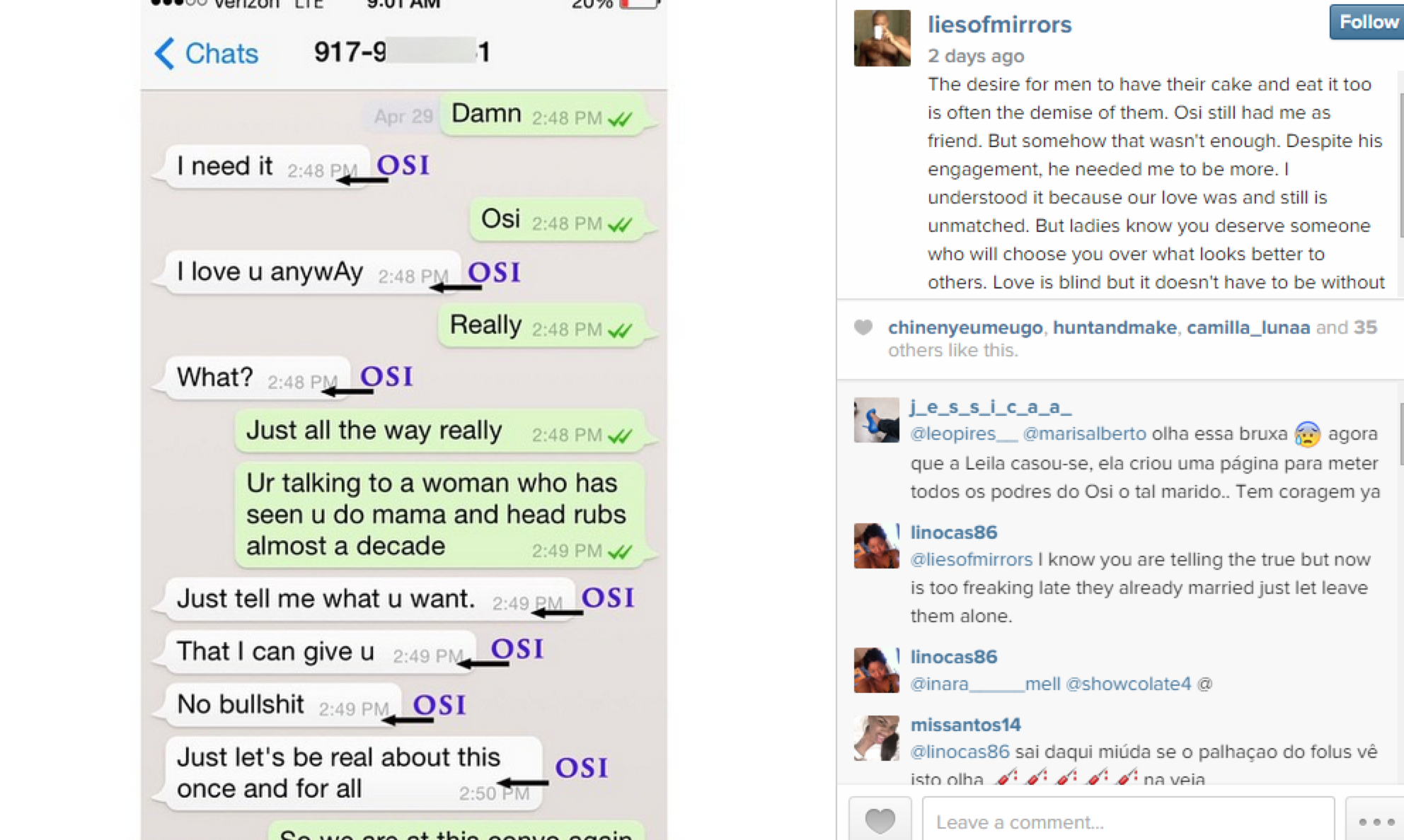 Said sidepiece set up an instagram account (just suspended) to post Osi’s alleged text messages he sent her while engaged, possibly at his fiancé’s side, but claims she said she didn’t do it to destroy Osi’s relationship. Right. She starts the account off with a nice little prologue to intro the situation: