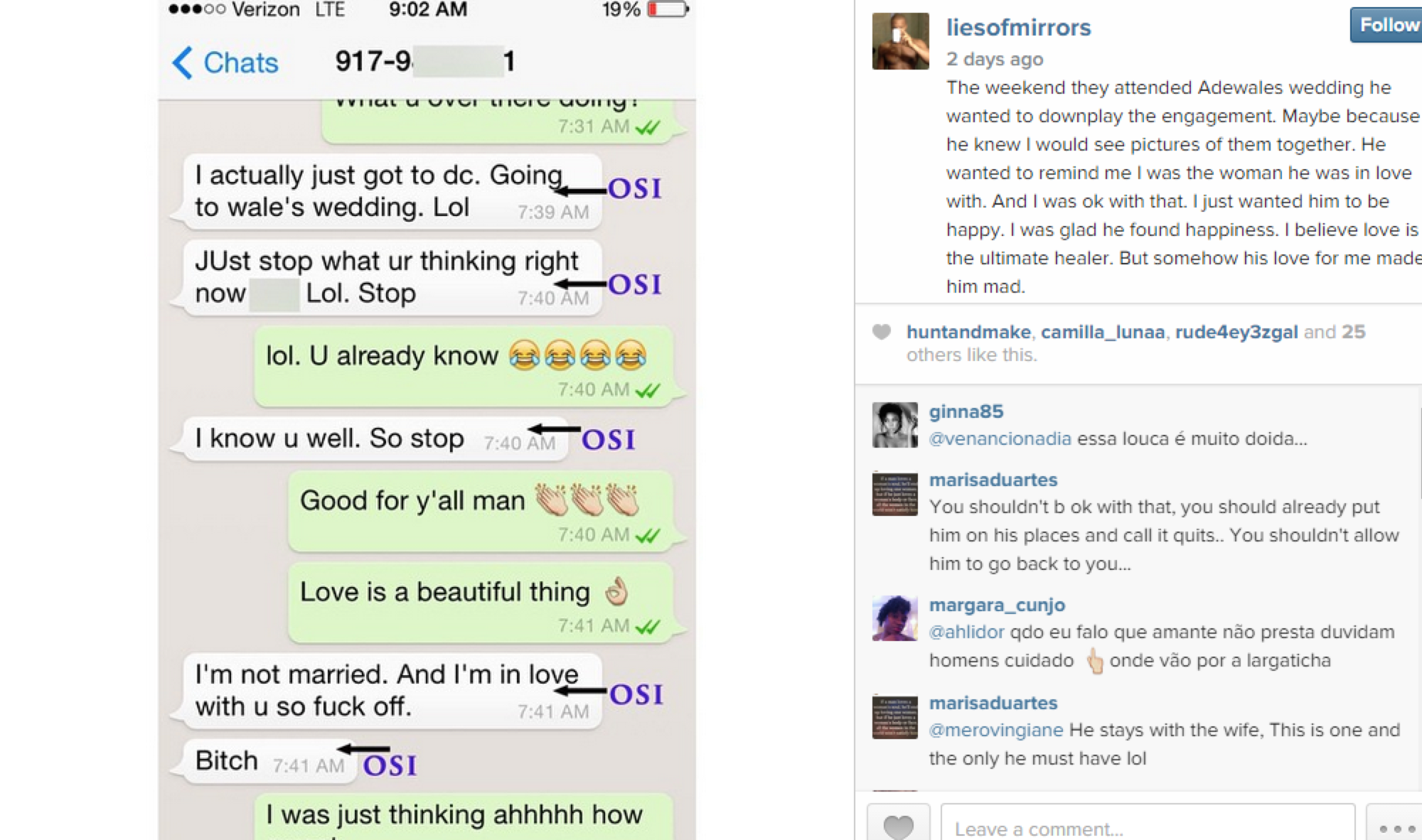 What Osi allegedly did: Texted his sidepiece from a wedding he was probably at with his fiancée, said he was in love with his SP again, told her to fuck off, called her a bitch.