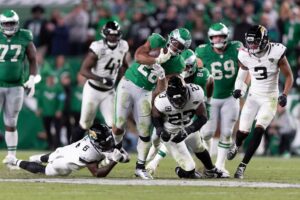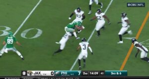 Eagles Saquon Barkley with the BACKWARDS HURDLE is One of the Sickest Things Ever Kevin Kinkead • Nov 3rd, 2024