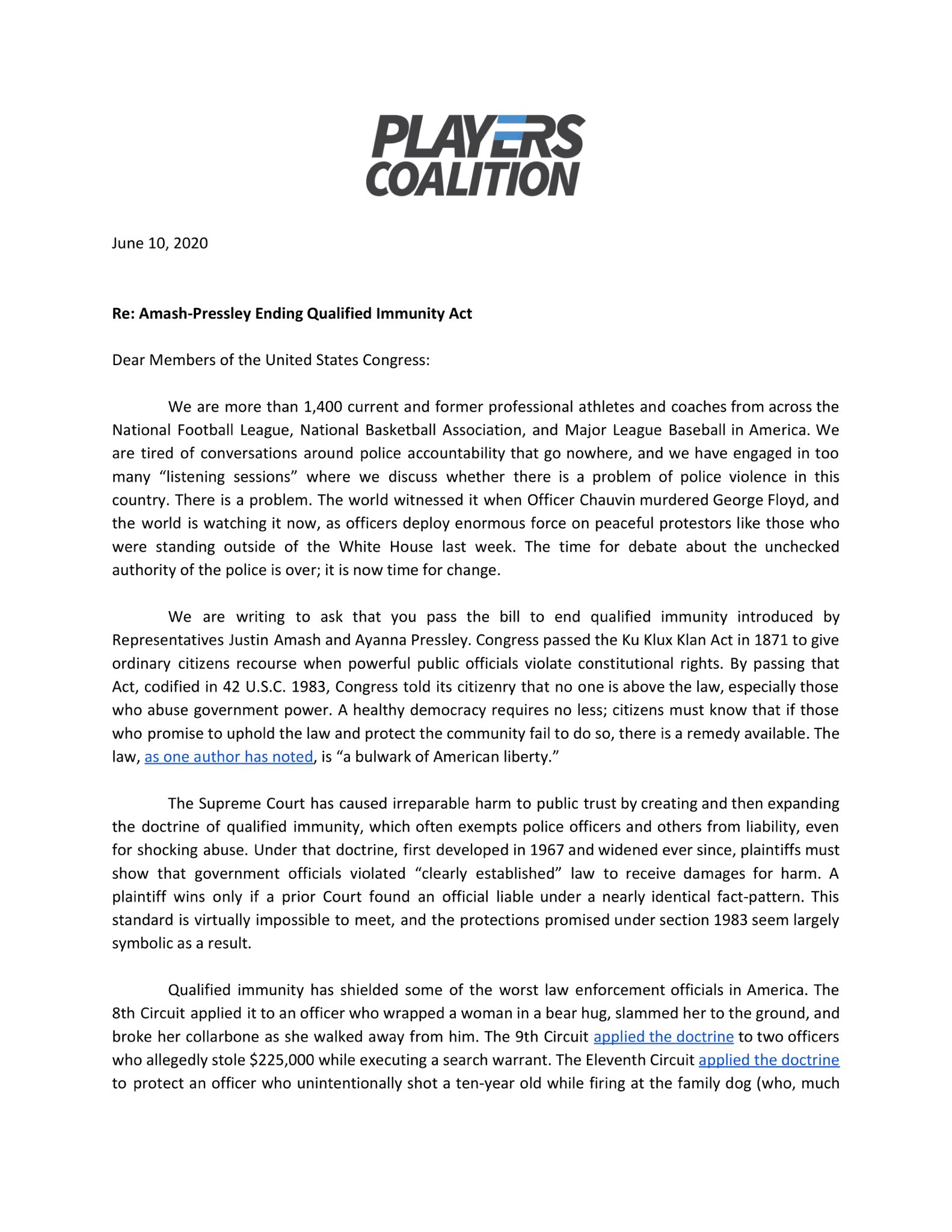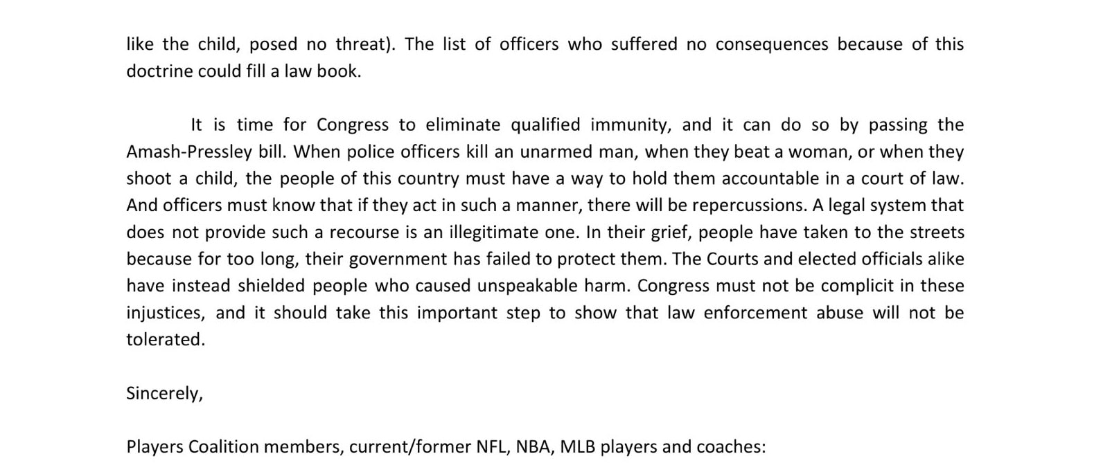 This is a massive group petition involving American athletes, coaches, and front office members, asking Congress to pass what’s called the “Ending Qualified Immunity Act.”