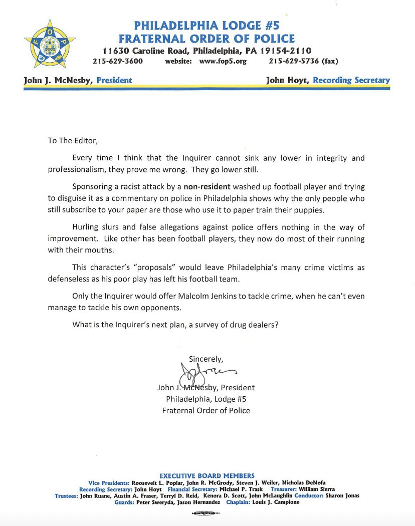 Philly’s Police Union President Rips “Washed Up” Malcolm Jenkins and the Philadelphia Inquirer