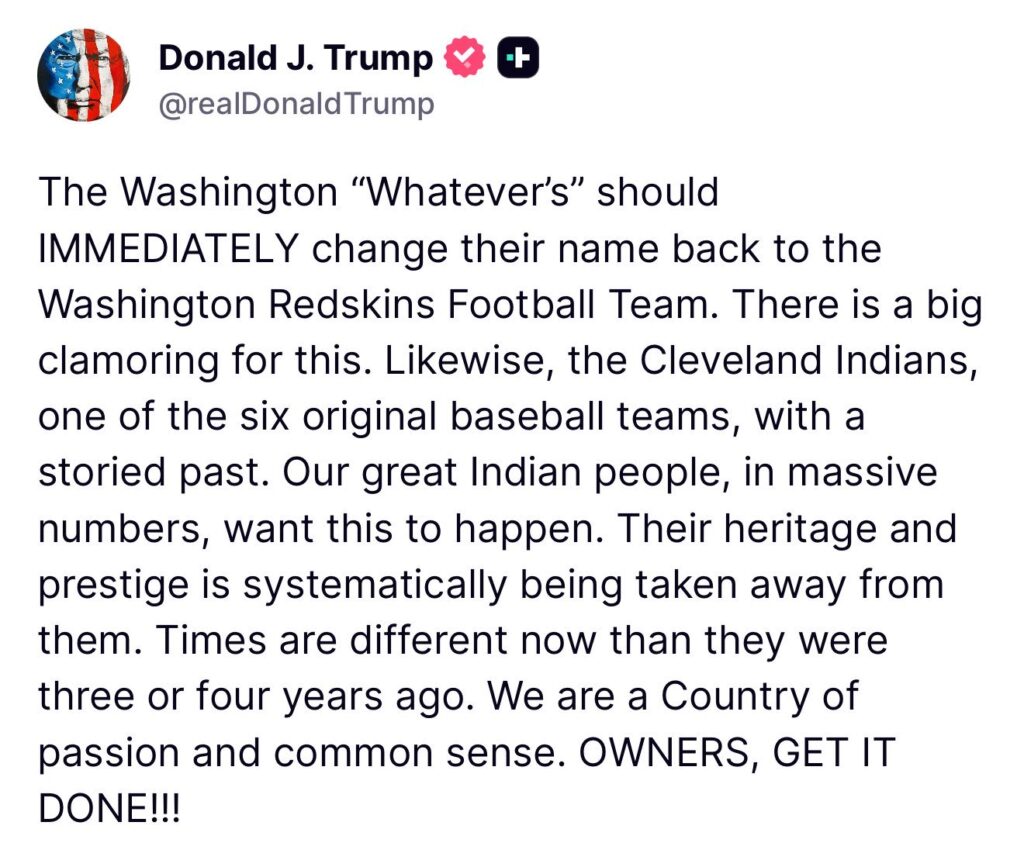 President Trump Wants the Commanders and Guardians to Use “Redskins” and “Indians” Again