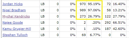 That was with a fully healthy Hicks, who played 16 games. He and Bradham both logged more than 900 snaps each while Kendricks was sparingly used.