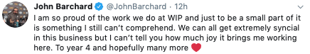 And today, Barchard celebrated his three year anniversary with WIP: