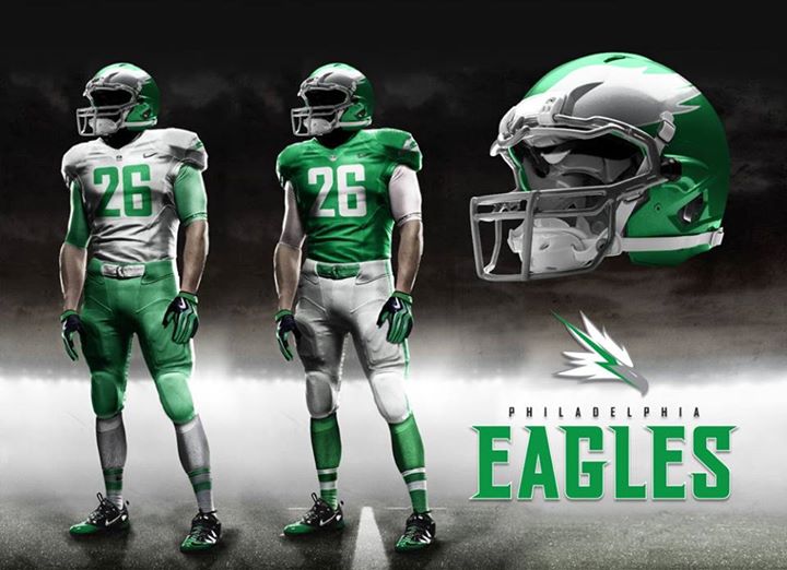 We’re very much for a switch back to Kelly Green for the Eagles, but the “Midnight Green” is Christina Lurie’s baby and there are no signs it’s going away anytime soon. Still, Kelly Green jerseys excite us, and they excite you too, so here’s a concept sent to by Brian Martone Illustration & Design. In the caption for the image on Facebook, Martone explained the elements: