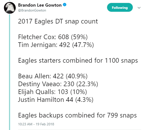 For instance, and I don’t think this gets talked about enough, but Allen actually played 422 snaps last year while Tim Jernigan played 492. So Beau was actually in there 41% of the time while Jernigan played 48% of defensive downs.