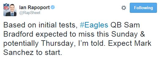 According to Ian Rapppppppopopopopopoprt – who completely muffed the Jordan Hicks diagnosis – Sam Bradford is likely to miss next week’s game and the Thanksgiving day game after a short week. But seeing as he said Hicks would be out for 2-4 weeks, and he’s missing the whole year, we can just assume Bradford’s career is basically over.
