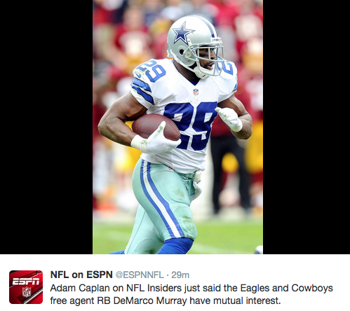 Unlike you and that girl you like that you always see at the coffee shop, the Eagles and DeMarco Murray are reportedly mutually interested in each other. According to Adam Caplan, both sides are interested. It’s very early and it’s all talk right now, but this could be huge. Or, it could just be Murray trying to piss off the Cowboys.
