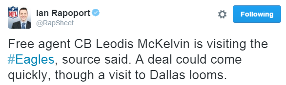 Free agent corner Leodis McKelvin is visiting with the team today and Ian Rapppopopopopopoprt thinks a deal could be imminent.