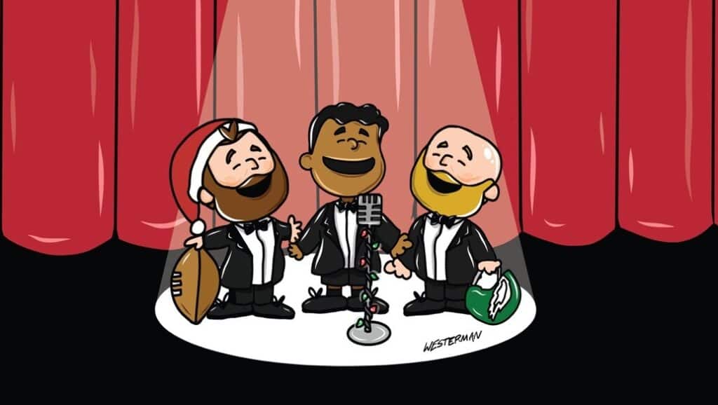 The Philly Specials released their second Christmas album, now streaming on Spotify and Apple Music just in time for your Christmas party! Make sure you tell your pops the album was recorded in the summer when he tries to blame tonight’s loss on the linemen not being focused. I review every new song that was released using my patented system of “Kelce Clauses.” Siskel and Ebert and Roeper had thumbs, The Source had the mics, and we have Jason Kelce wearing a Santa hat: