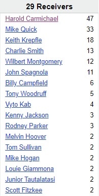 Jaws threw 47 regular season touchdowns to Carmichael while the pair hooked up for six postseason scores. Carmichael easily tops a list of Jaws’ TD catchers that includes some other fantastic players, among them Mike Quick and Charlie Smith.