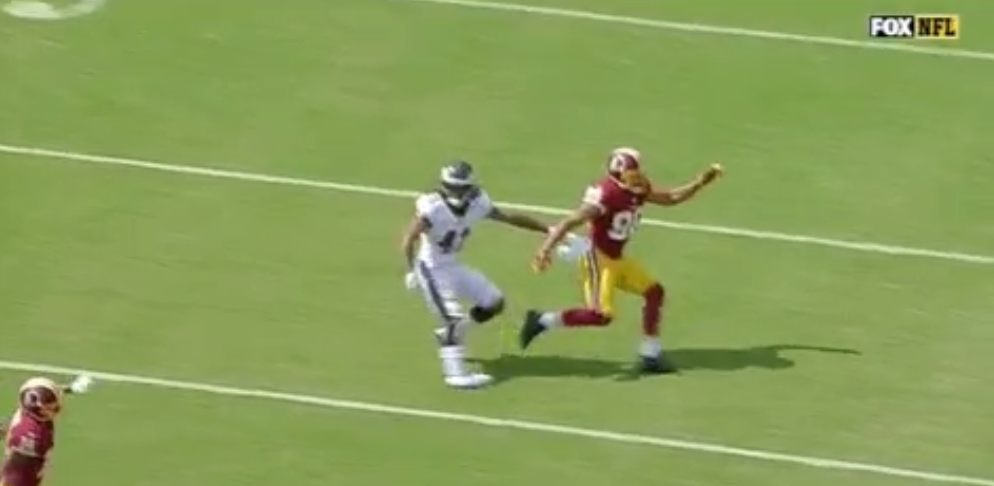 It was a non-contact injury while covering Jordan Reed – he may have stepped on his foot? – during a Redskins possession midway through the second quarter. He was later carted off the field with the team around him.