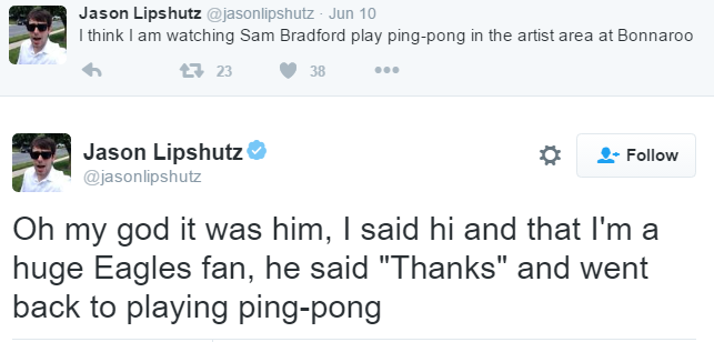 We all know Connor Barwin is the de facto hipster on the Eagles, Jason Kelce is the every man, and Carson Wentz is the guy who buys sunblock in bulk. But did you know Sam Bradford is the festival bro? Yeah, you probably did just by looking at him and guessing that he owns about 40 bucket hats.Bbut he proved it this year with a trip to the Bonnaroo music festival in Tennessee: