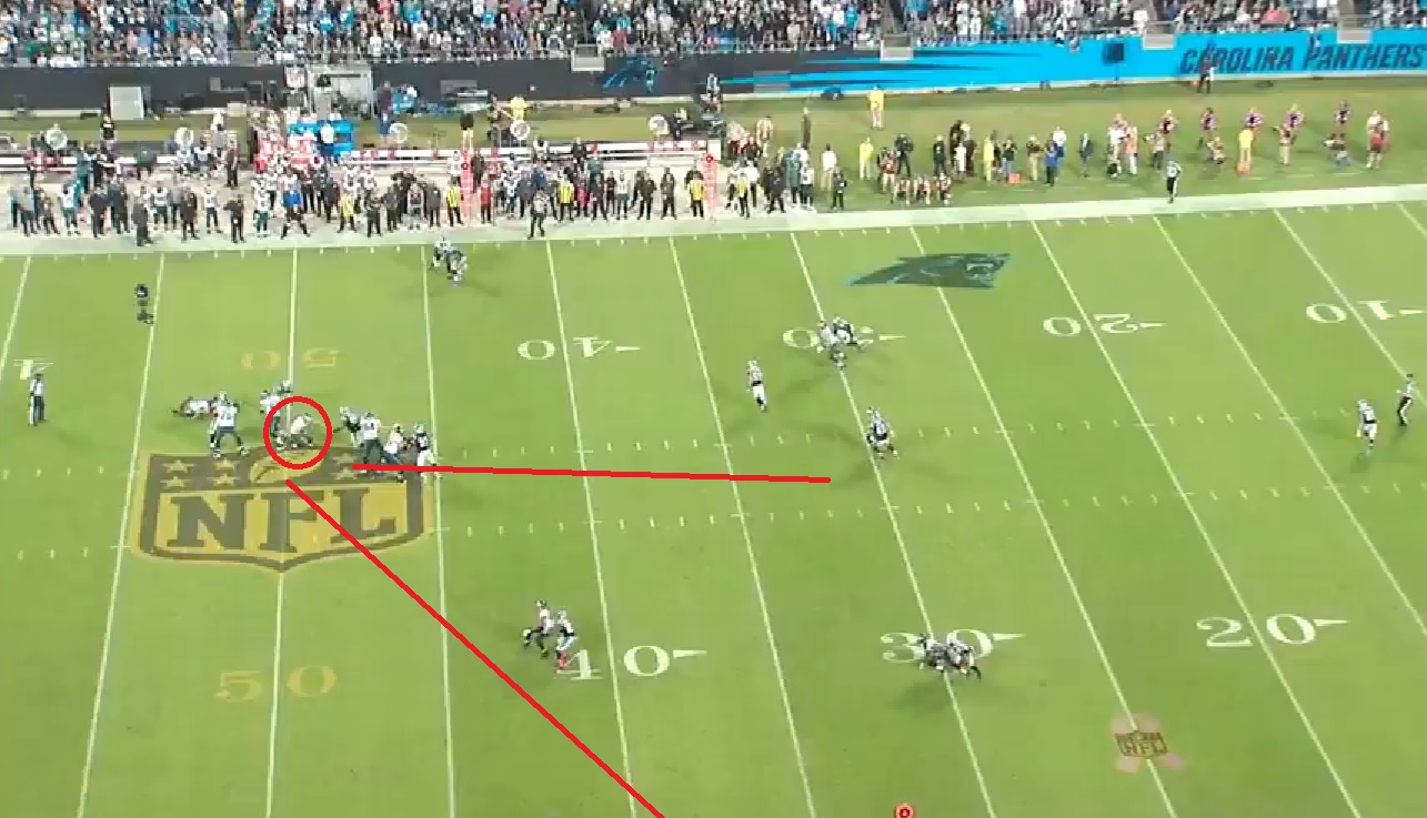By this point, Jason Peters was out with back spasms and the Panthers’ rush was causing problems. With 12:51 left in the second quarter, Sam did a good job feeling the pressure and scrambled for two yards. But he failed to see Zach Ertz wide open at midfield, just behind the linebackers, for what could have easily been a 30-yard gain. (See photo at the top of this item.)