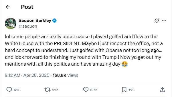 Saquon Barkley was pictured with Donald Trump at one of the President’s golf courses this past weekend, leading to a lot of political hemming and hawing in the replies of various social media posts. Saquon’s response: