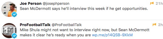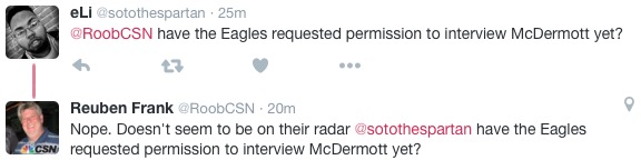 I took some flak for that one, I guess because I’m a hater and negative and all. Maybe. But it does reek of desperation that McDermott, who’s interested in a head coaching job, whose team is in the playoffs, agreed to an interview with a sports talk radio station in Philadelphia to remind people that he exists and is interested in a head coaching job.