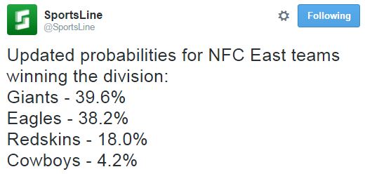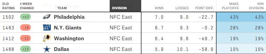 Let’s start with FiveThirtyEight, where the Eagles are 43% favorites to win the division, and the only NFC East team projected to win this week. Their defeat of the Patriots gave them the biggest jump in the Elo rating (and gave the Pats the biggest drop), which certainly helps them here. [The Pats still have a greater than 99% chance to win their division, and a 19% chance of winning the Super Bowl. Panthers are currently at 21%, and the Eagles are at “<1%”.]