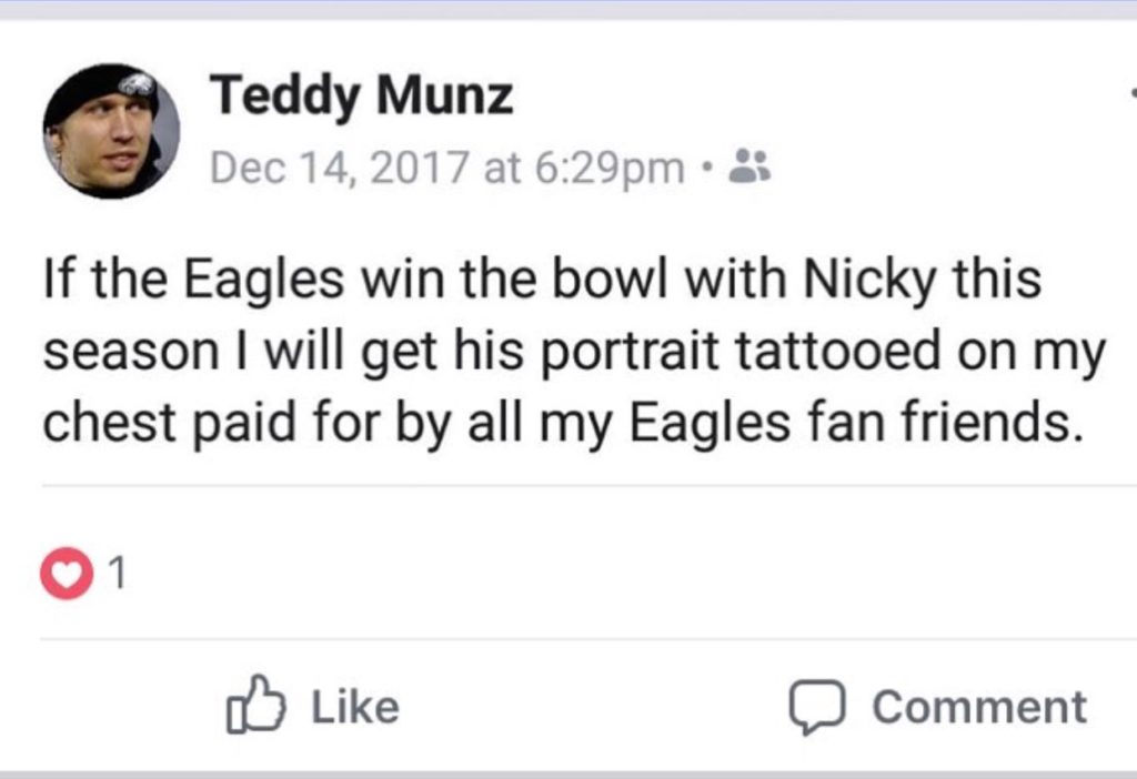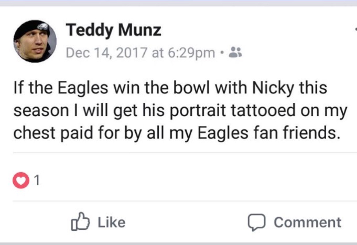 You can also get a tattoo. Yesterday, Kevin Kinkead wrote about Twitter user @ManDorgan who had the “Philly Special” play drawn on his right forearm. Now meet South Jersey resident Teddy Munz, who made this proclamation shortly after Carson Wentz went down for the season with a torn ACL back in December.