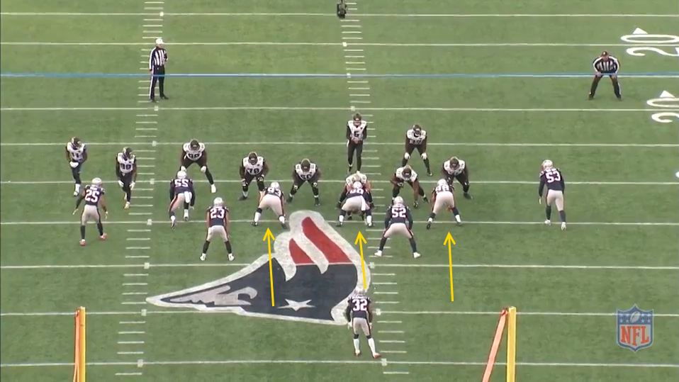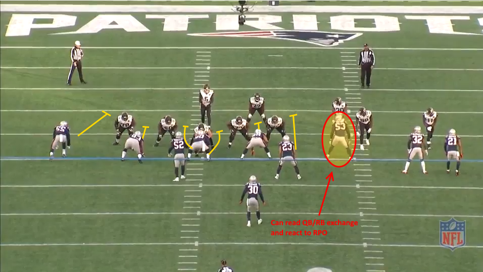 Another way Belichick and Patricia try to take away the RPO is by asking a defensive lineman to play two different gaps (two-gap). The RPO is designed to put linebackers in conflict. As they pursue their gap to stop the run, they leave a void behind them for the quarterback to throw.