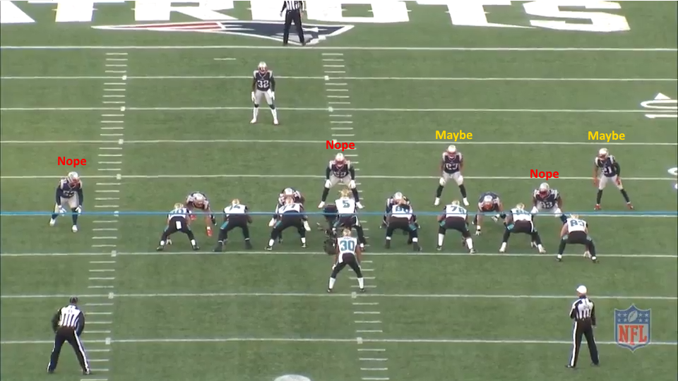 New England’s run defense this season ranked 30th in DVOA. Not great. As a result, though, Patricia puts great effort into mixing up his defensive fronts and looks to gain a strategic advantage with personnel match ups. New England is given a 3-4 defensive label by default, but they are far from just a 3-4 team. They will put anywhere from three to six players up on the line of scrimmage.