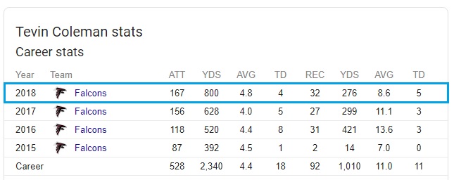 As for Coleman, he was part of a 1-2 punch with Devonta Freeman down in Atlanta that was derailed this season when Freeman suffered a knee injury and later had groin surgery. That resulted in Coleman sharing the load with Ito Smith, and he put up career highs in rushing attempts, rushing yards, and receptions: