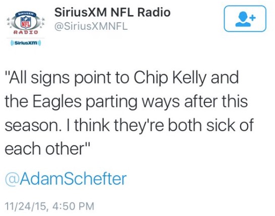 Meanwhile, Twitter lit up (briefly), Mike Missanelli had Sal Paolantonio on to spew nonsense actually correct the record and note that Schefter did not report Chip Kelly was leaving, and 97.5 currently has Adam Schefter scheduled for tomorrow morning, presumably to simply read what he said because no one seems to be able to take two seconds to look up the full quote themselves, except for Joe Giglio, who screengrabbed that incorrect Tweet sent out by Sirius. Amateur hour today.