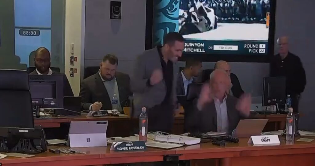 In this case, it’s a short clip, but Jeffrey Lurie seems to be a sounding board more than anything, yeah? He’s in the front row but seems to be someone to ask questions and bounce information off of. Howie is running the show, but communicating with the rest of the player personnel staff. Then you get the fist pump and immediate action on the phone, followed by the celebration.