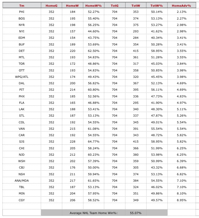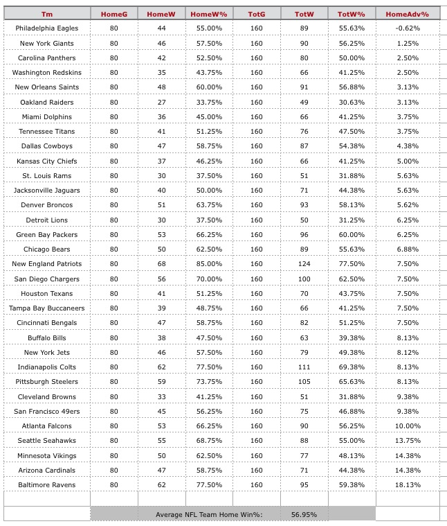 It’s not because of Santa Claus, D batteries, or Tie Domi. It’s not because all the travesties that take place in other cities aren’t equally as/more disgraceful. No, it’s quite simple and calculated actually: The sports fans of Philadelphia have given their teams the worst advantage to win a game when playing in front of a home crowd. Over roughly the last 10 years in the four major sports in North America (NFL, MLB, NBA, NHL), Philadelphia teams have performed worse at home than any other team in their respective leagues.