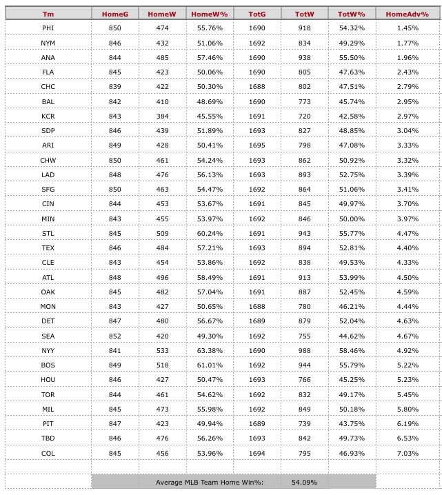 To find out how well a team uses their home field advantage, you compare a team’s overall winning percentage over the last 10 years to their home winning percentage over that same period. For instance, the Phillies have a .543 Win Percentage – good enough for 5th in MLB – over the last 10 years. Their winning percentage at home over that same span is a .558, which is only good for 13th. That small .015 improvement they see at home is slimmer than every other team in baseball over that same time period, with the average MLB team being .041 better at home.